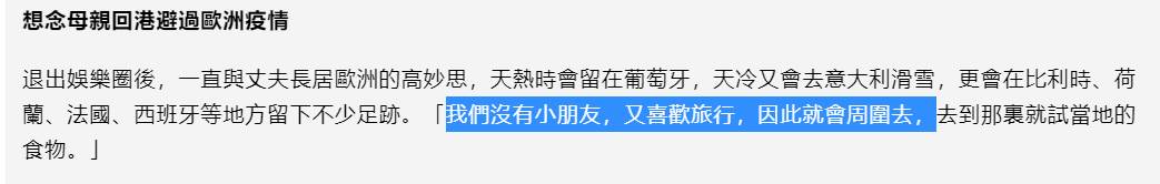她透露,夫妻倆至今無兒無女,因為喜歡旅遊,愛享受美食,所以這些年經常周遊列國。天熱會留在葡萄牙,天冷了會去義大利滑雪,還有很多國家都有兩人的足跡。