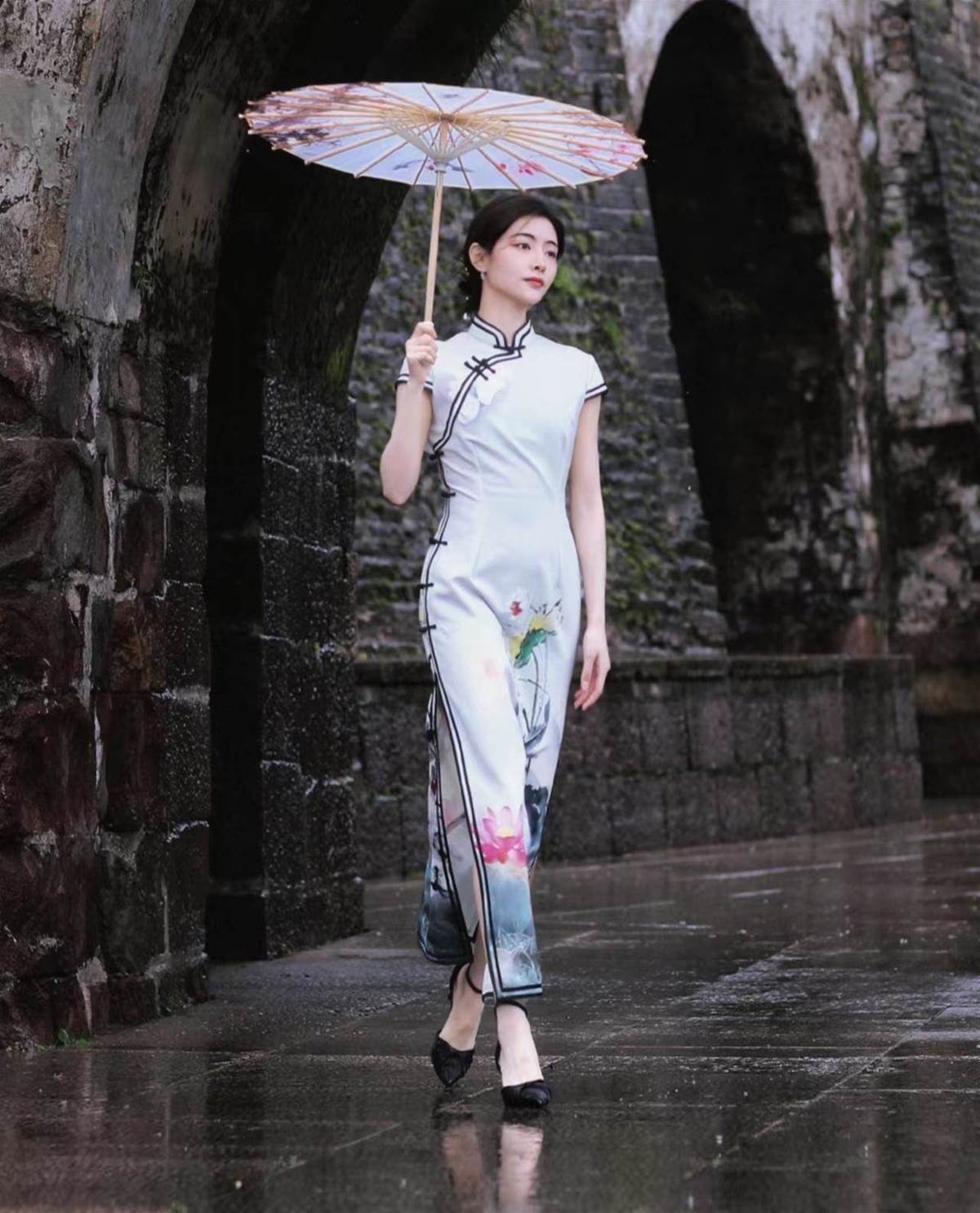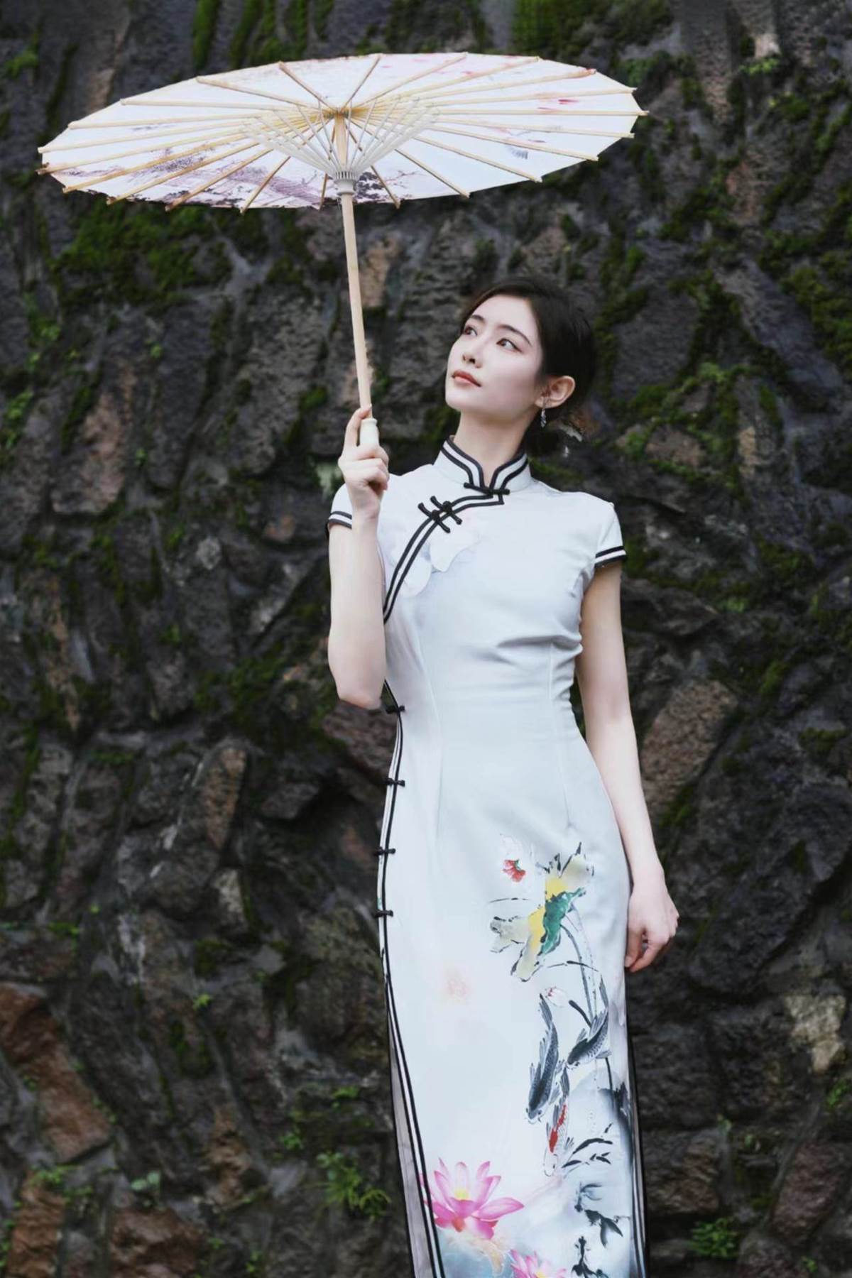 從樣式和花色上看,選的是較為傳統的風格,素色的旗袍上點綴著水墨畫,顯得十分古典與雅致,更帶來一種清淡的味道。