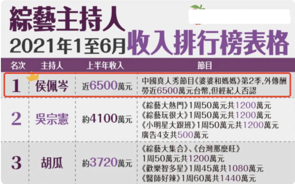 侯佩岑之前和黃伯俊在某夫妻真人秀《婆婆和媽媽》合體,兩個人帶著侯母上節目後人氣大增,黃伯俊的憨厚老實和侯佩岑的果斷直爽形成了鮮明的對比,之前還有人曝光過侯佩岑的綜藝收入(6500萬臺幣),該爆料並沒有得到證實,但侯佩岑的吸金能力有目共睹。