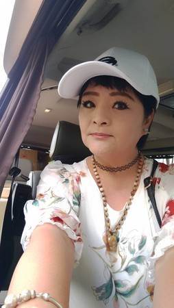 畫面中的她頭戴白色鴨舌帽,身穿灰色短T,黑色短裙,雙手伸出大拇指的她狀態很好,看不出她已經是花甲的年紀了。她身後的旅遊車的噴繪十分霸氣。