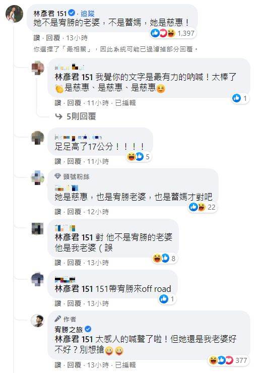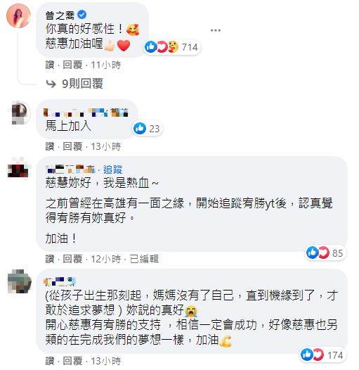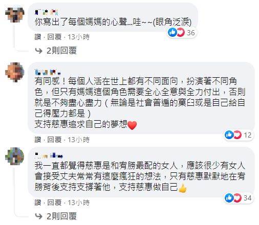 貼文曝光不到一天就吸引14萬網友點讚分享,大家紛紛留言表示「從孩子出生那刻起,媽媽沒有了自己,直到機緣到了,才敢于追求夢想」、「支持另一半,真的很重要,這是家庭很重要的一環」、「真的好喜歡蕾媽!但現在更愛慈惠」、「10年全職媽看得淚流滿面」、「慈惠妳好,支持妳做自己。」