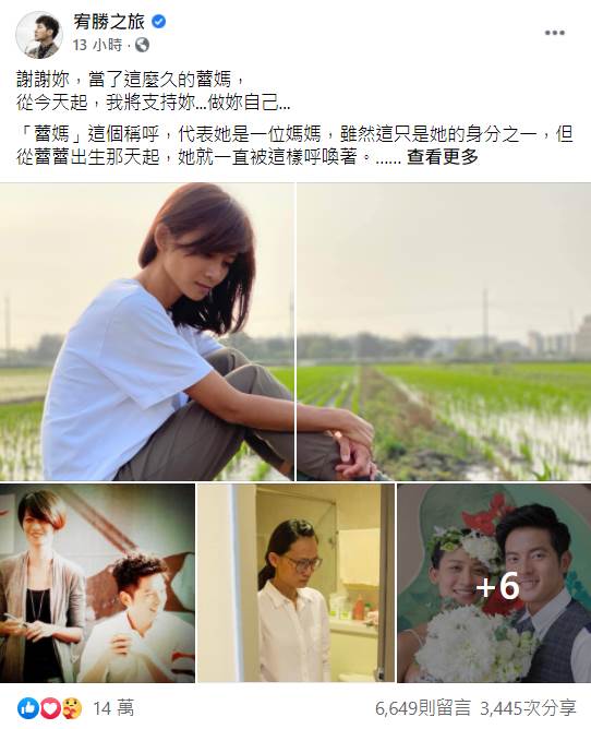 在過去6年分享日常生活時,宥勝總會用「蕾媽」來稱呼老婆,不過日前他卻在個人臉書發了長文表示:「謝謝妳,當了這麼久的蕾媽,從今天起,我將支持妳...做妳自己...」更洋洋灑灑PO出10張照片並寫到:「照片中這位女子,她的本名叫林慈惠」,會如此大方的公開老婆的本名,其實是因為對方做了他意想不到的決定。