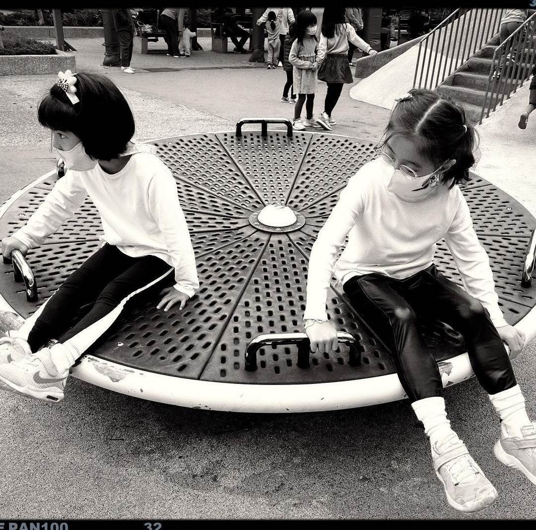 姐妹倆坐在遊戲器械上,累得發呆,需要好好休息緩一緩。