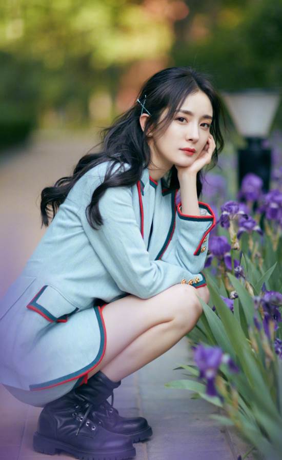 楊冪蹲著拍照的照片有不少,經常在時尚硬照鏡頭前凹造型,女王氣場強大。