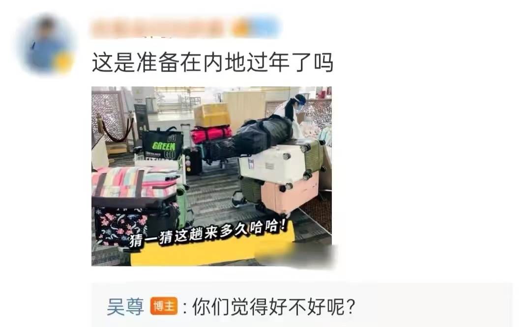 由于他們帶了大大小小數十個行李箱,所以有不少網友猜測他們準備在中國過年,對此吳尊並沒有表示否認,反而反問網友:「你們覺得好不好呢?」這番模棱兩可的回應,也讓網友更加肯定自己的猜測。