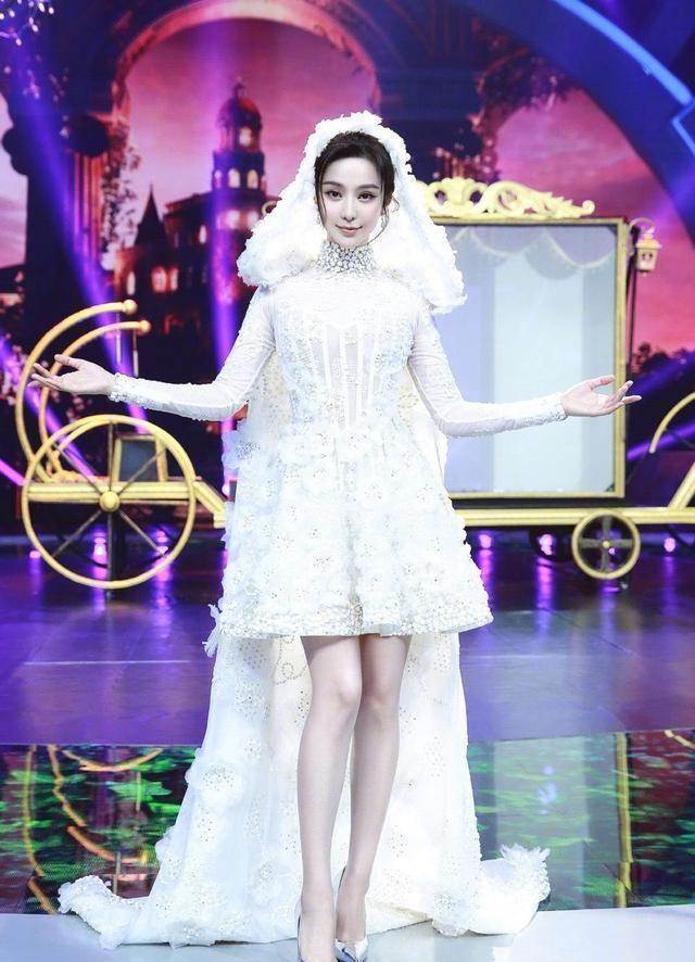 身穿白色短裙范冰冰看起來就像是即將步入婚姻殿堂的幸福的新娘子一樣,臉上掩蓋不住的幸福,讓她看起來更加的俊俏。頭紗的設計就像童話裡的公主一樣,非常具有童真。前面的設計跟後面的設計沒有繼承中國傳統的對稱美,前面的裙擺在膝蓋之上,使得范冰冰看起來非常的性感,後面拖地的設計拉伸了他整個人的身材比例,使得范冰冰的身材比例達到一個精緻完美的狀態,讓人非常的驚豔。