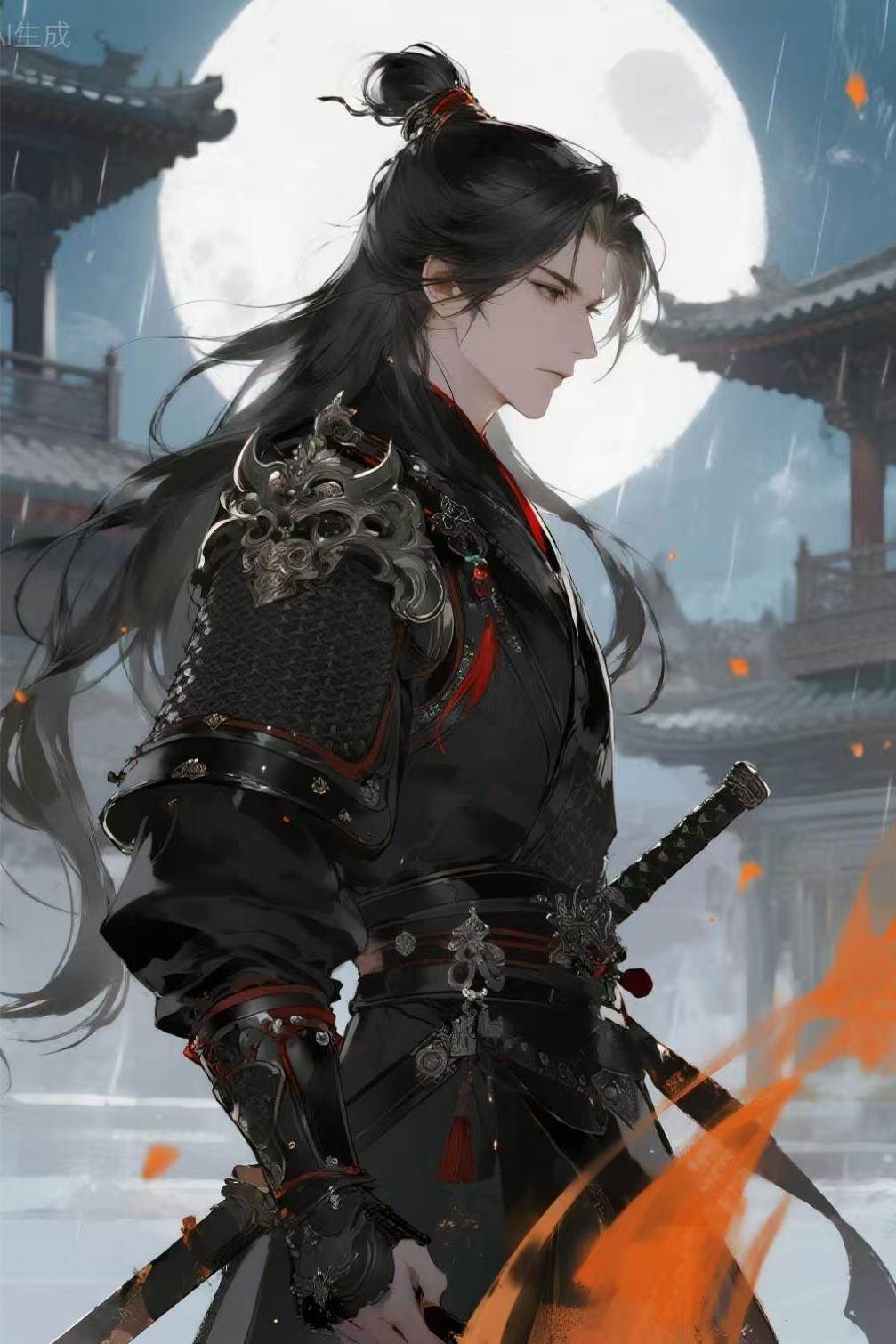 個穿著鎧甲,扎著髮俊美男子,正練劍。