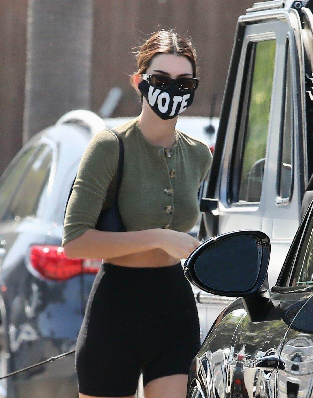 這是肯達爾·詹娜當天現身的樣子,肯達爾·詹娜這次扎了一個漂亮的發髻,戴著黑色的墨鏡和酷酷的口罩。