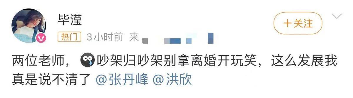 隨后,洪欣和張丹峰之中的疑似第三者畢瀅也加入到混戰之中,畢瀅作為經紀人,她此前跟張丹峰之間的曖昧被曝光。