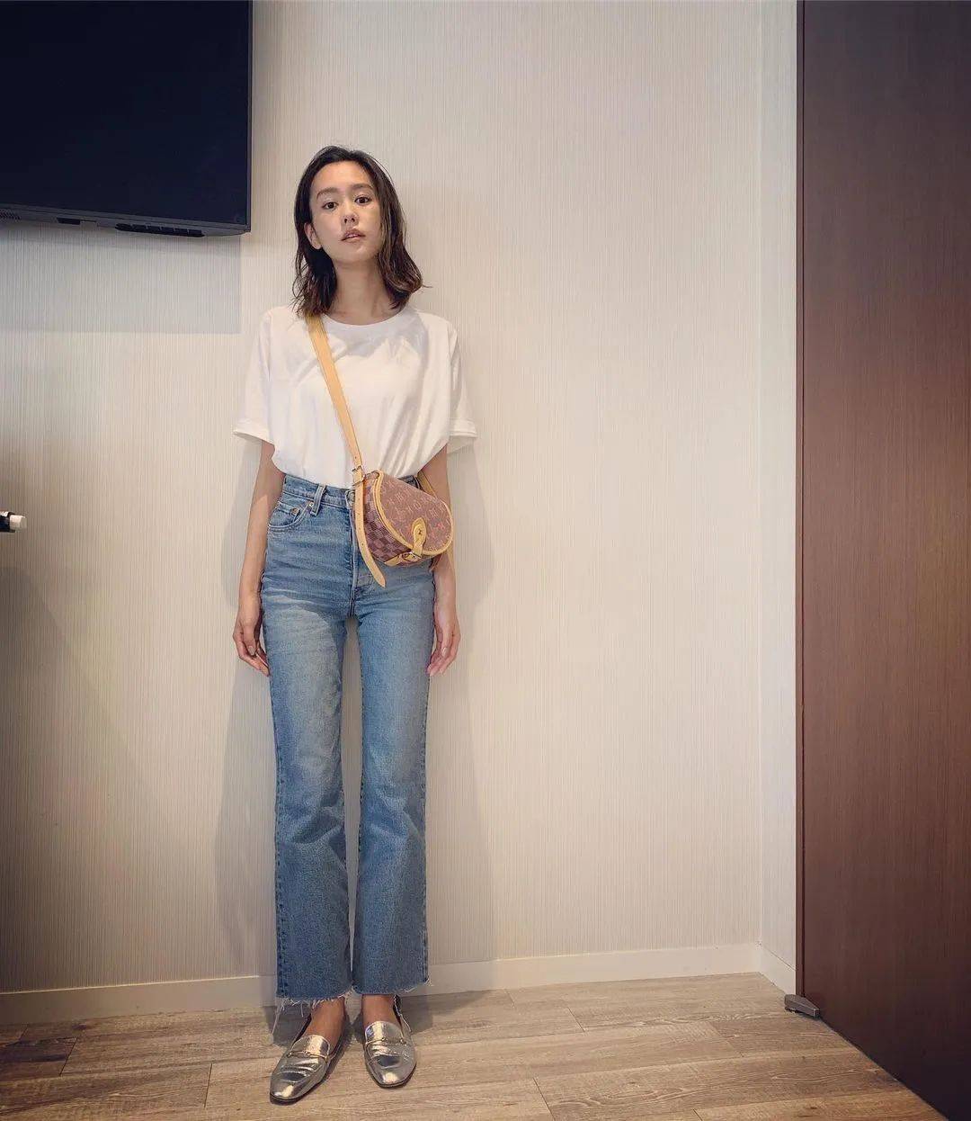 白T+闊腿牛仔褲的經典搭配,再來一個彩色包包,打破單調,活力滿滿,超級適合上班通勤。