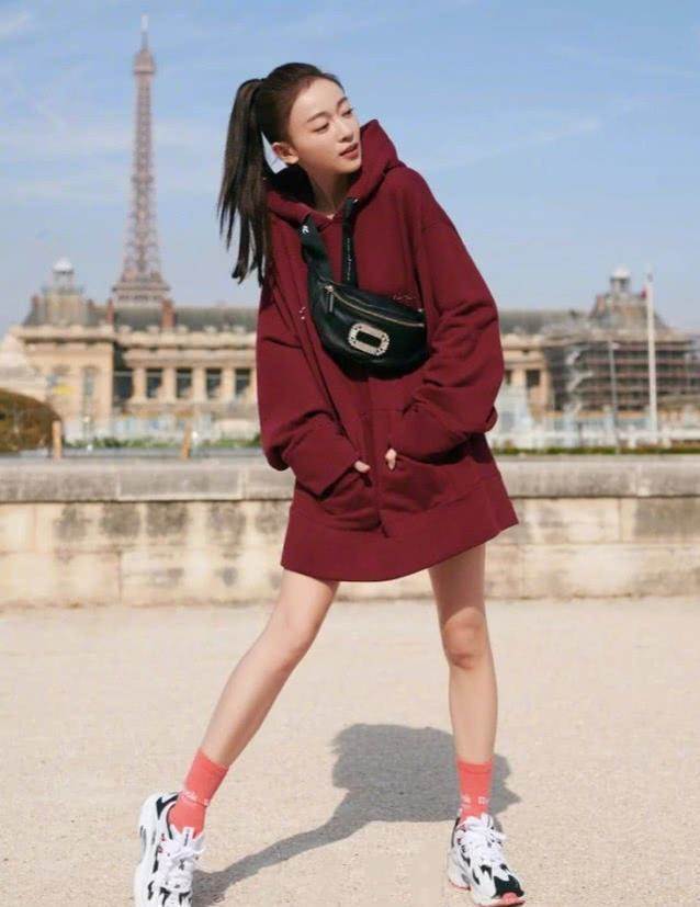 吳謹言的其他穿搭也是蠻顯時尚感的,不妨再來一起瞧瞧吧!吳謹言身穿著一件酒紅色的衛衣,是寬鬆的版式,而且長度也是蠻長的,簡直就可以拿來當裙子穿。