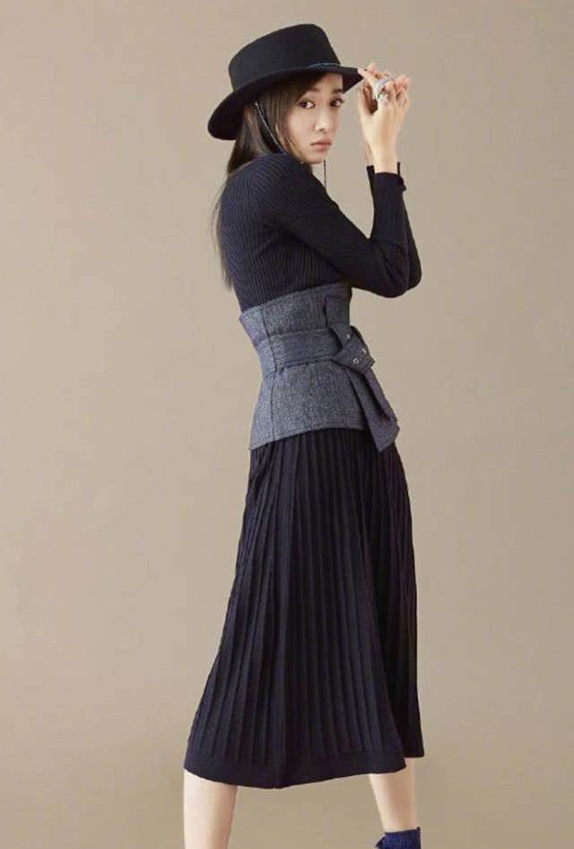 這件長裙就很不一樣了,吳謹言駕馭起來十分凸顯牛仔風的魅力。她穿的這件裙子是深藍色的顏色,其實看起來快接近黑色了,但是比黑色淺一點,也就不會看起來太霸氣。