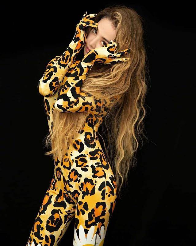 然後我們來看下半身的造型,下半身的造型雖然沒有什麼過多的修飾,依舊延用了上半身的豹紋圖樣,但是在大腿的部位,增加了雛菊的印花,這樣整體看起來和上半身的豹紋印花就形成了一個非常鮮明的對比,為整體的造型增加了幾分新鮮感。