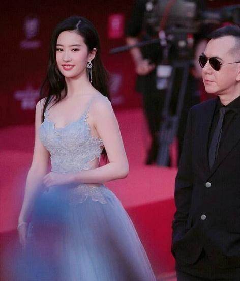 在裙擺的位置採用比較清新淡雅的天藍色,天藍色作為禮服的顏色既能夠起到很好的亮眼效果,又非常符合劉亦菲的天仙氣質,淡淡的藍色呈現出很好的水天一色的感覺,既大氣又充滿浪漫感。