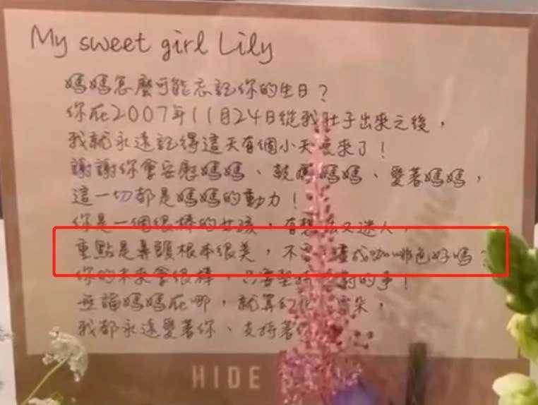 小S還特地在生日卡片里夸贊了二女兒的鼻子,強調二女兒的鼻頭很完美,不用再化出咖啡色。