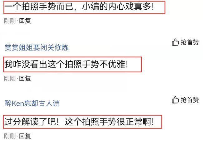 這位娛樂博主的言論引起了網友們的熱議,有一位網友在評論區留言,「我咋就沒看出這個拍照手勢不優雅」,還有一位網友在評論區留言,「過分解讀了吧!這個拍照手勢很正常啊」,甚至還有網友在評論區留言,「小編的內心戲真多」。
