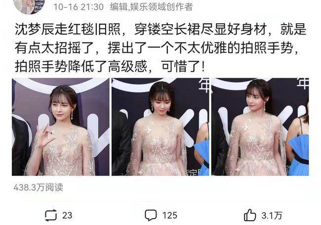 10月16日,有一位娛樂博主在個人社交帳號中曬出了一組沈夢辰走紅毯的舊照,並配文「沈夢辰走紅毯舊照,穿鏤空長裙盡顯好身材,就是有點太招搖了,擺出了一個不太優雅的拍照手勢,拍照手勢降低了高級感,可惜了」,短短幾個小時,該娛樂博主就收穫了400多萬的閱讀量,這無疑給沈夢辰帶來了不小的熱度。