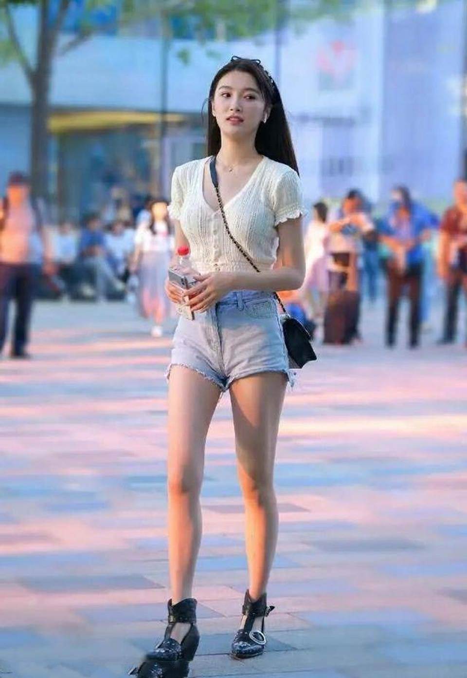 如同牛仔褲一樣,牛仔短褲也有很多不同的款式,比如流蘇邊的版型,再比如A字形短褲等等,像這位美女所穿的款式,就偏向于A字款式,但它的褲腿設計又很個性,看著還以為是牛仔褲裁剪來的呢,褲腿口有毛邊的設計,營造了這樣的「假象」,也增添了整條短褲的時髦與潮流,讓美女的穿搭更豐富多彩。對于上衣的選擇,美女也是穿了這麼一款雪紡的上衣,如此穿搭在夏季會很舒適,因為可以透氣涼爽,同時短款的設計還可以凸顯自己的小蠻腰,你發現了嗎?從側面來看,美女實在太苗條了,特別是這雙纖細的長腿,有了牛仔短褲的反襯作用,我們看得是一目了然。而腳上的這雙厚底涼鞋,也是一款時尚單品,款式看著就跟個性,難道不是嗎?