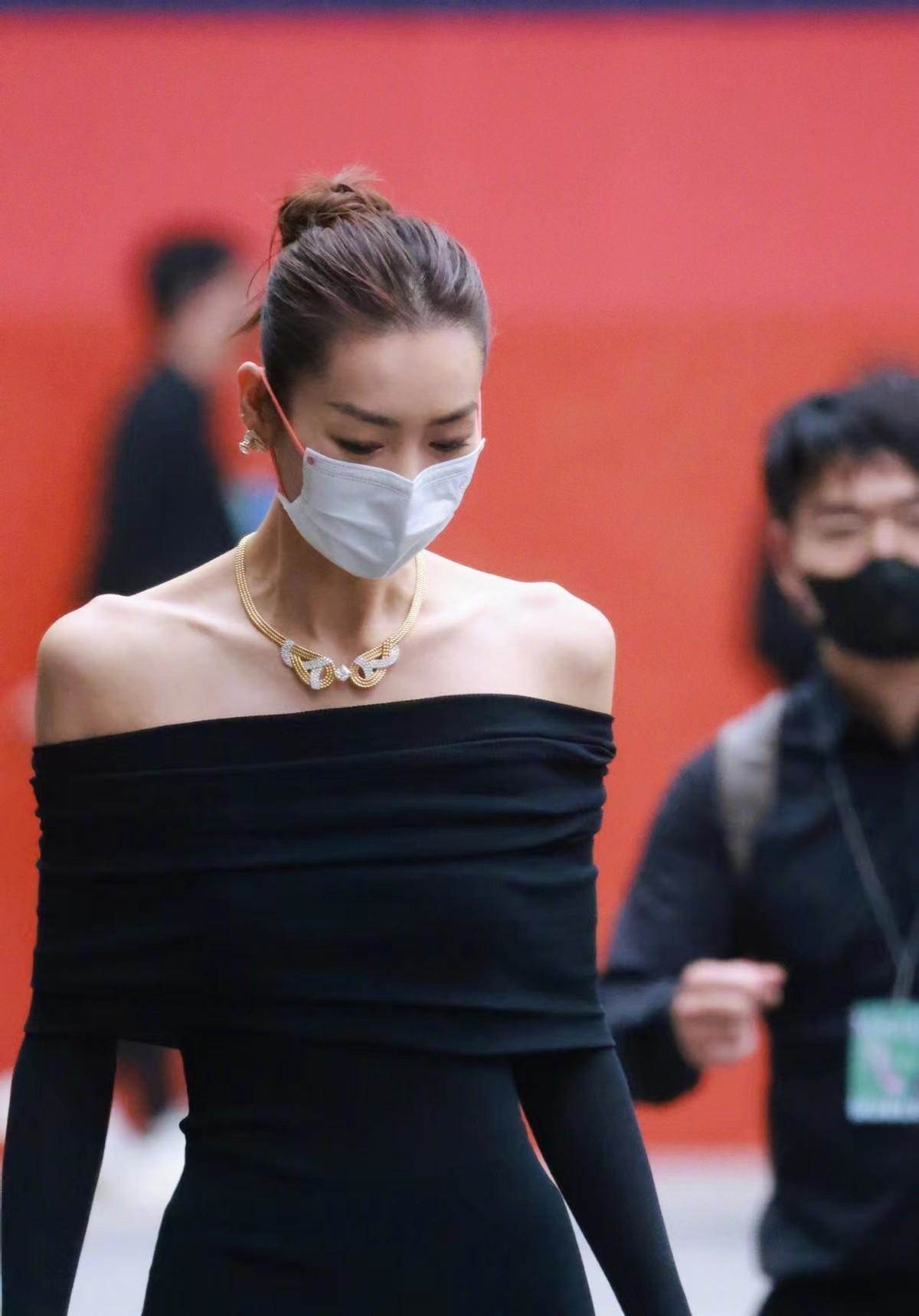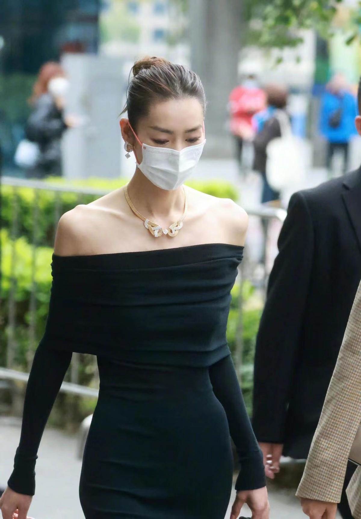 我們就拿劉雯的這身裙裝穿搭來說,雖然整個領部是一字領的款式,但是因為領口明顯的造型感加上更加夸張的露膚性,也就讓橫領的款式照樣可以起到顯瘦和修飾的效果。
