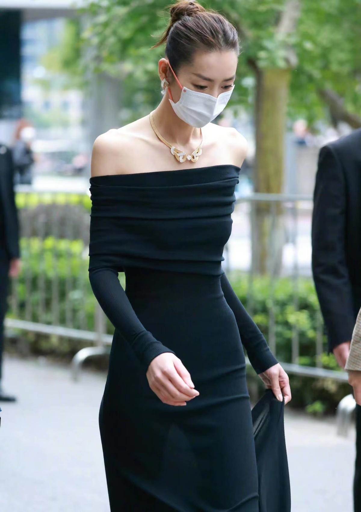 第一點就是弱化黑色的亮度和飽和度,我們可以通過面料的屬性來做到這一點,比如緞面的面料,會更好的增加顏色的亮度,針織的面料,會降低 顏色的亮度,而劉雯這身造型,針腳細密的針織面料因為有著一定的透膚性,所以也就弱化的了黑色的色調和飽和度,加上透膚的效果,也會讓黑色的亮眼感更加明顯。