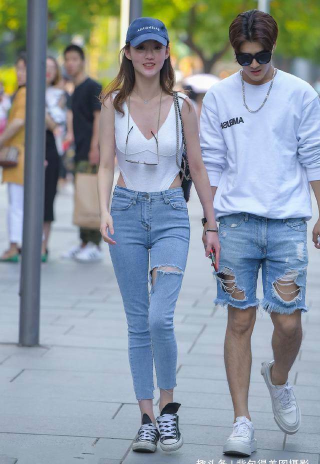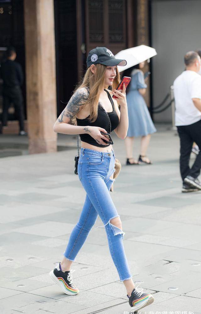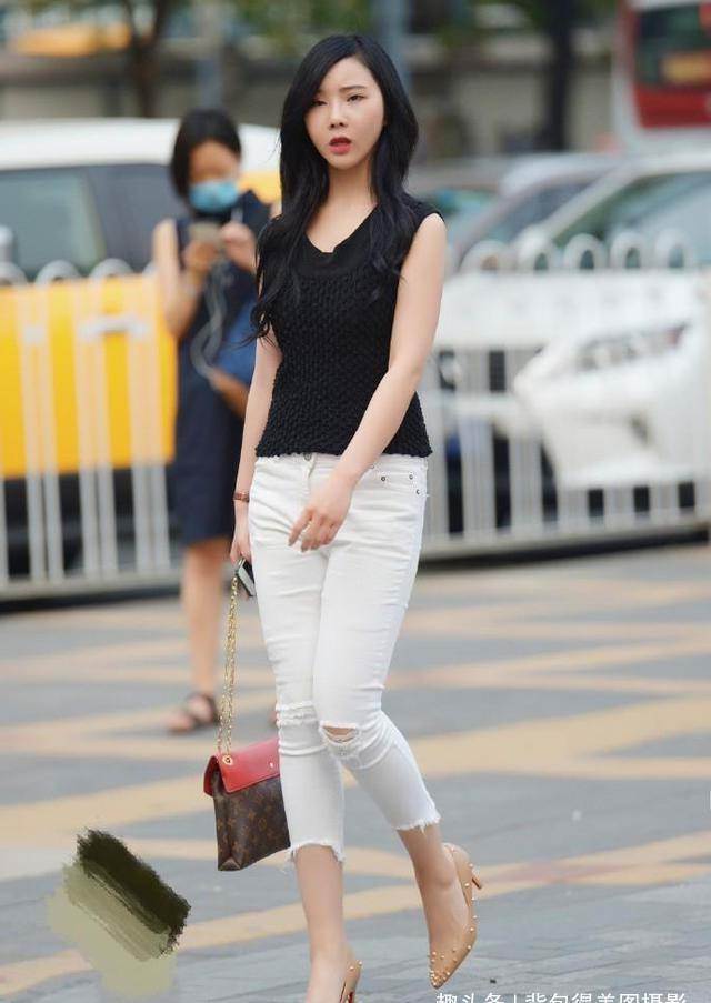 路人街拍,小姐姐穿了吊帶黑色背心,看著很苗條