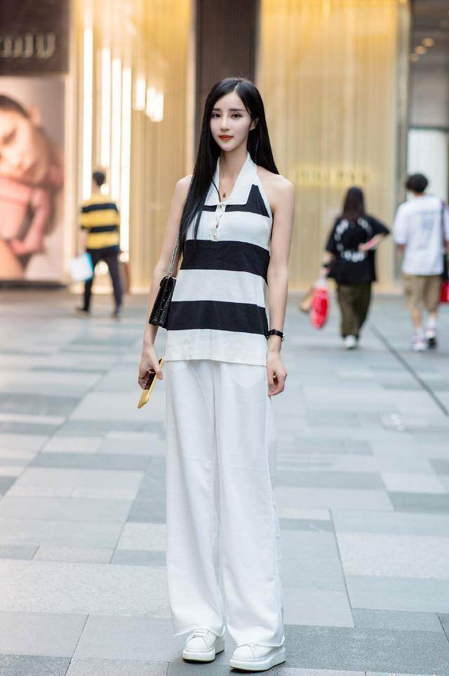小姐姐的這條白色運動褲,有點闊腿褲的感覺,和運動風的氣場很一致。